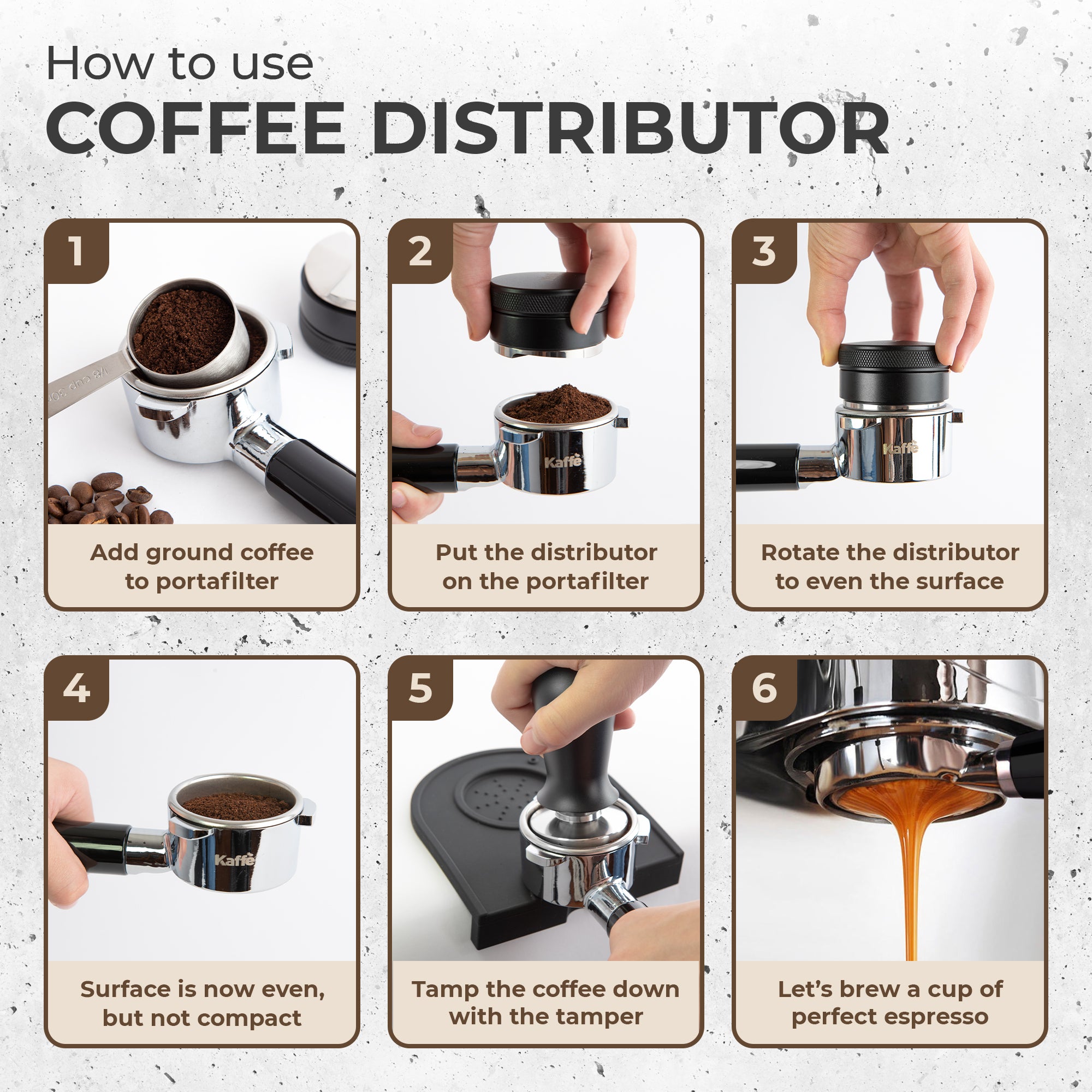 IMPROVE ESPRESSO BREW CONSISTENCY - Using Kaffe's WDT Distribution tool, stir coffee grounds while they sit in the portafilter. The stirring action breaks up any clumps and evens out the density of coffee within the puck to make the perfect espresso.
